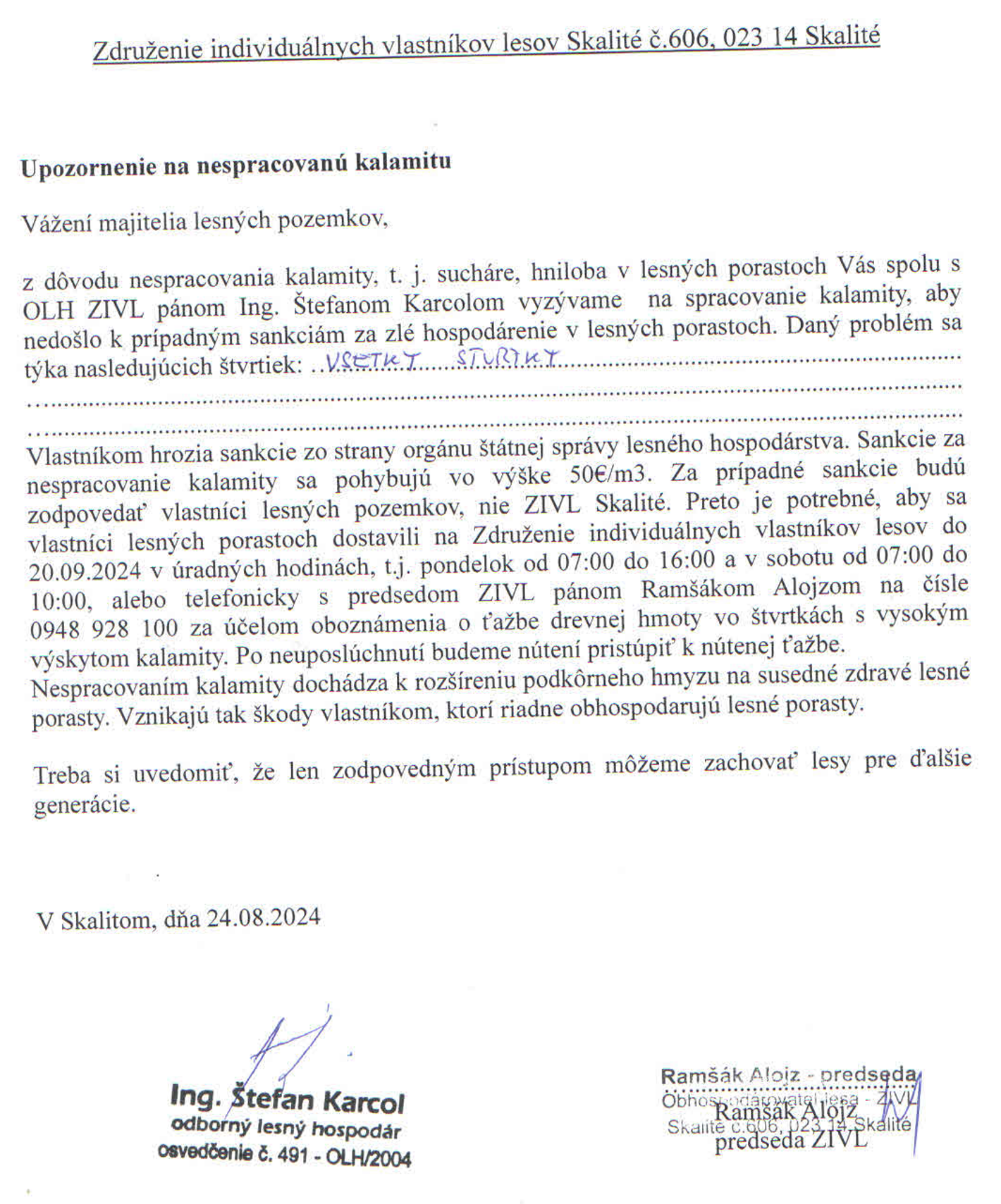 Vlastníkom hrozia sankcie zo strany orgánu štátnej správy lesného hospodárstva. Sankcie za nespracovanie kalamity sa pohybujú vo výške 50€/m3. Za prípadné sankcie budú zodpovedať vlastníci lesných pozemkov, nie ZIVL Skalité. Preto je potrebné, aby sa vlastníci lesných porastoch dostavili na Združenie individuálnych vlastníkov lesov do 20.09.2024 v úradných hodinách, t.j. pondelok od 07:00 do 16:00 a v sobotu od 07:00 do 10:00, alebo telefonicky s predsedom ZIVL pánom Ramšákom Alojzom na čísle 0948 928 100 za účelom oboznámenia o ťažbe drevnej hmoty vo štvrtkách s vysokým výskytom kalamity. Po neuposlúchnutí budeme nútení pristúpiť k nútenej ťažbe.