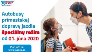 Na základe rozhodnutia Žilinského samosprávneho kraja budú spoje prímestskej dopravy v Žilinskom regióne od 01. júna 2020 (pondelok) premávať v špeciálnom režime. V rámci špeciálneho režimu budú pridané ďalšie spoje, ktoré zabezpečia najmä prepravu žiakov do materských škôl a základných škôl.