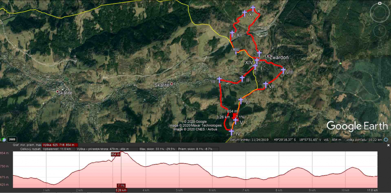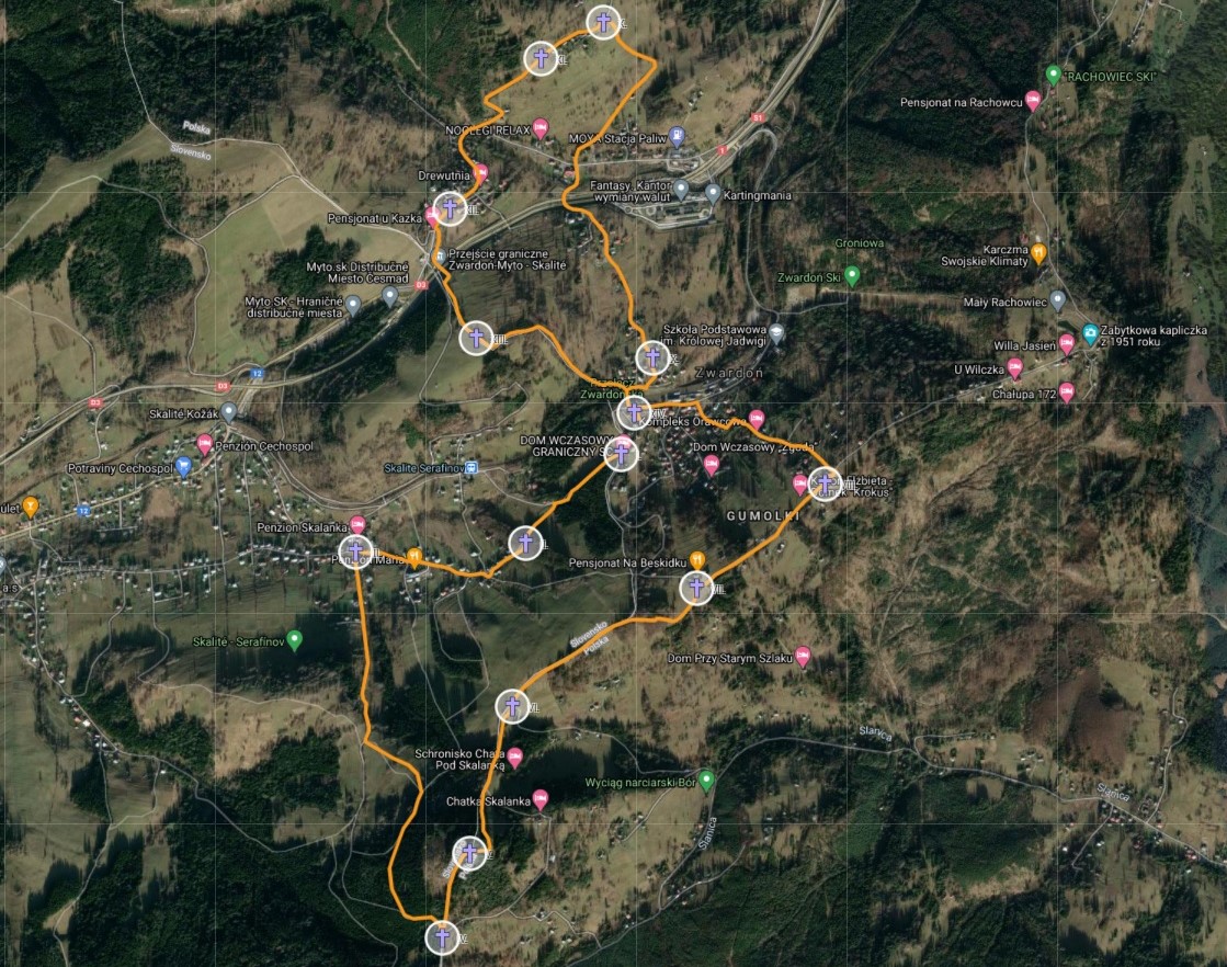Celá krížová cesta má podľa zamerania 11 kilometrov. Prvé zastavenie je priamo na hranici Skalité - Serafínov / sedlo Zwardoň (turisticky prechod). Krížová cesta ďalej pokračuje ku kaplnke pri Snežienke, kde sa nachádza druhé zastavenie a tretie zastavenie je následne pri kaplnke pri Skaľanke. Tu sa krížová cesta skrúca doľava smerom hore po panelovej ceste až za Skaľanku (IV. zastavenie). Od štvrtého zastaveniu už pokračuje krížová cesta po hranici, cez najvyšší bod 867 m n.m. - vrch Skaľanka (V. zastavenie), pokračujúc cez miestne časti Zwardoňa až späť ku kostole vo Zwardoni.