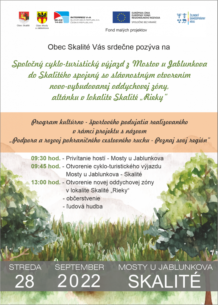 Obec Skalité v spolupráci s obcou Mosty u Jablunkova Vás pozývajú na spoločný cyklo-turistický výjazd spojený so slávnostným otvorením novo-vybudovanej oddychovej zóny, altánku v lokalite Skalité - Rieky, kde bude pre hostí a účastníkov pripravené občerstvenie.