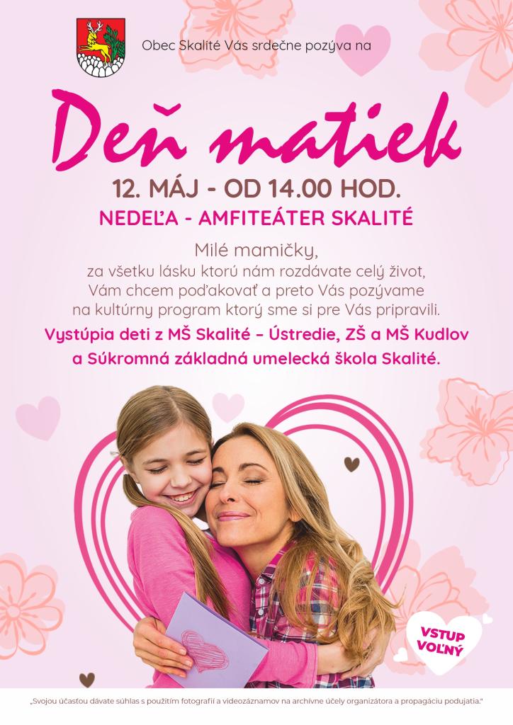 Obec Skalité srdečne pozýva všetky mamy, staré i prastaré mamy, babky i babinky na slávnostný program ku DŇU MATIEK dňa 12.05.2024 o 14:00 hod. v amfiteátri v Skalitom ako poďakovanie za Vašu lásku a obetavosť. Pre všetky mamičky aj malé prekvapenie.