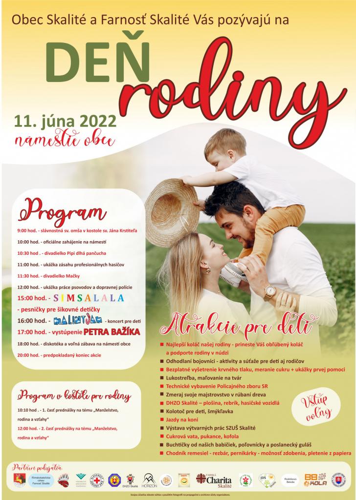Obec Skalité a Farnosť Skalité Vás srdečne pozývajú na veľkú rodinnú akciu v sobotu 11.6.2022 "DEŇ RODINY". Počas celého dňa budú pripravené rôzne sprievodné podujatia a atrakcie. Viac na plagáte.