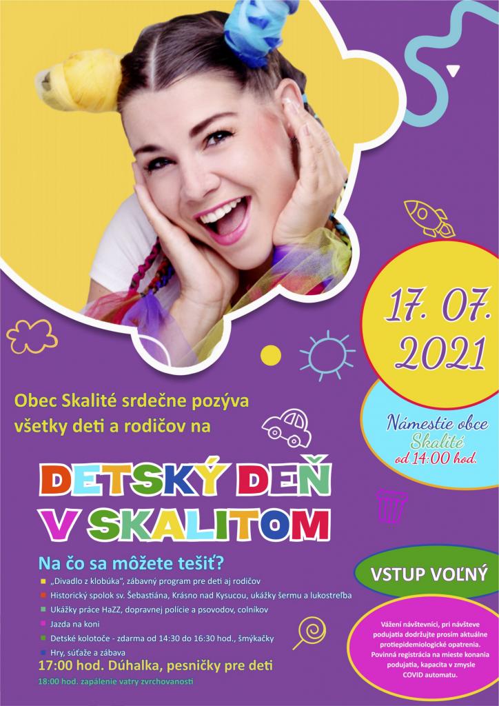 Obec Skalité, CVČ, Spoločenstvo Horizont, SZUŠ Vás srdečne pozývajú už túto SOBOTU 17.7.2021 na DETSKÝ DEŇ V SKALITOM od 14:00 do 18:30 hod.. Tešiť sa môžete na jedinečný program pre deti, ktorý zavŕšime zapálením vatry zvrchovanosti.