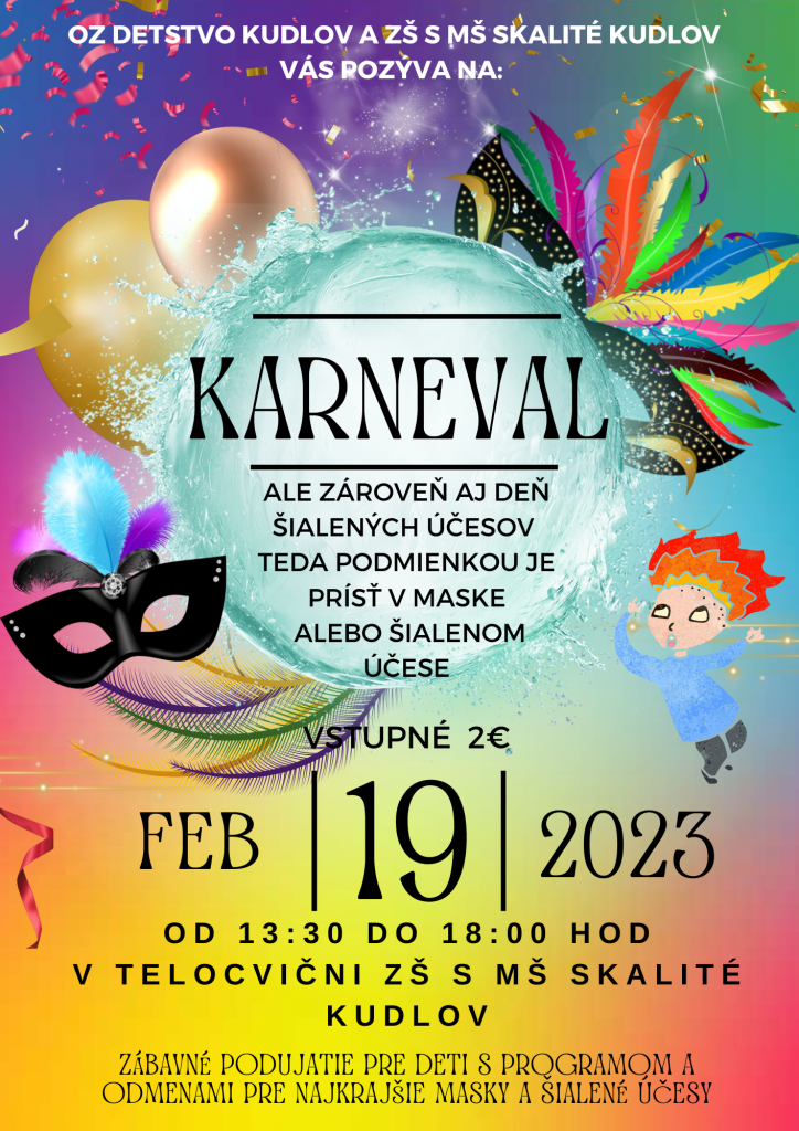 KARNEVALOVÁ PÁRTY v maskách a šialených účesoch sa koná 19.februára od 13:30 hod. v telocvični Základnej školy s materskou školou, Skalité Kudlov.