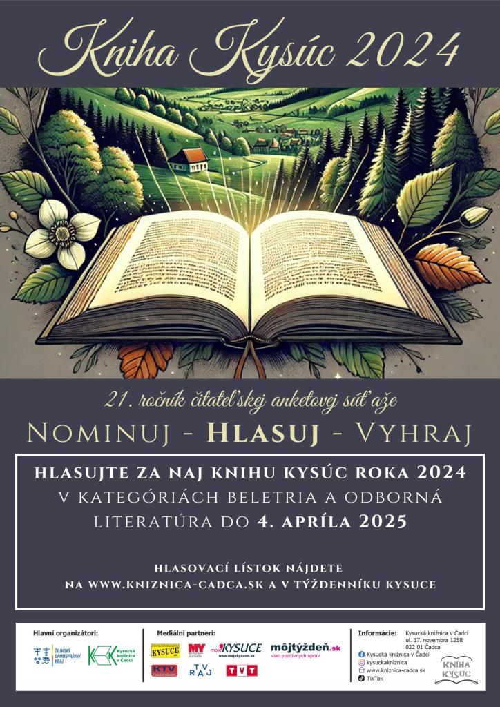 Kysucká knižnica v Čadci vyhlásila 21. ročník anketovej čitateľskej súťaže Kniha Kysúc 2024. V termíne od 3. marca do 4. apríla môžete hlasovať i vy v kategóriách beletria a odborná literatúra za zaujímavé knižné tituly, ktoré boli vydané v roku 2024 a sú späté s našim regiónom témou alebo osobnosťou autora.