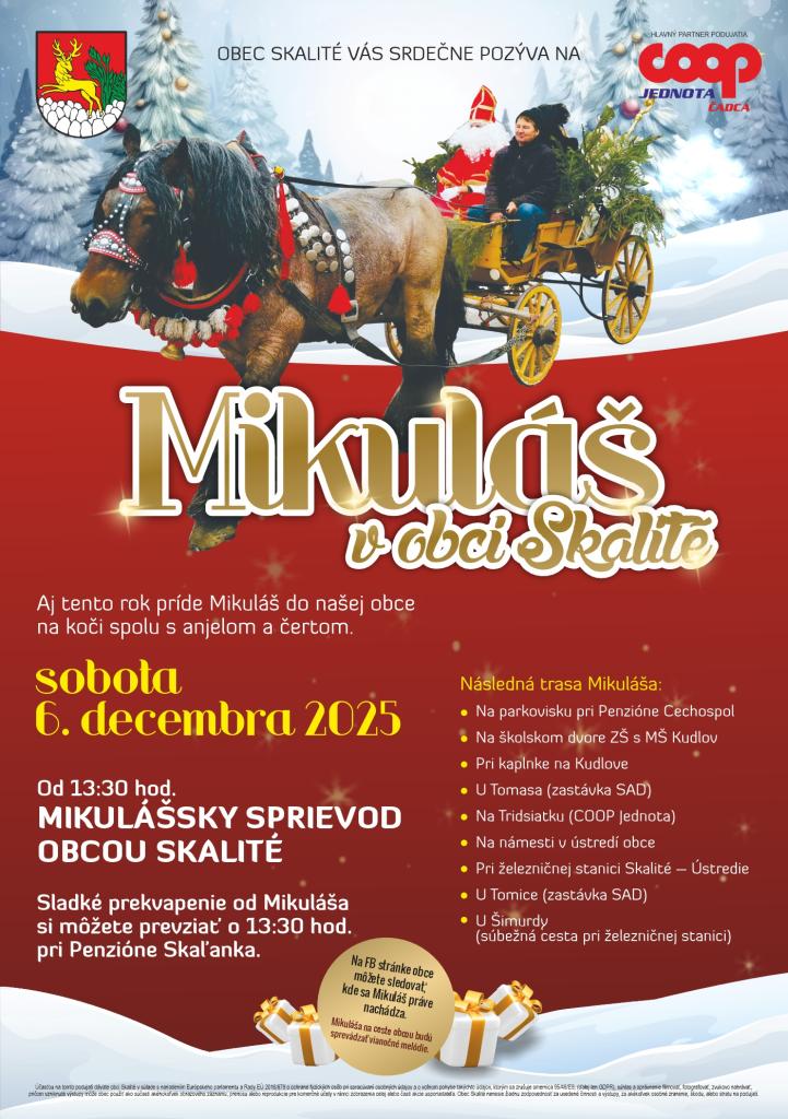 Mikuláš na koči začne 13:30 prechádzať dedinou smerom od Penziónu Cechospol až do Šimurdy. Presna poloha Mikuláša bude online na FB stránke obce Skalité.