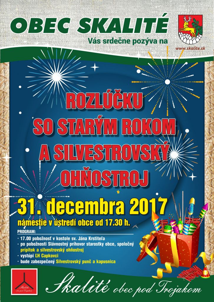 Obec Skalité Vás srdečne pozýva na rozlúčku so starým rokom 2017 a silvestrovský ohňostroj. Viac o akcii sa dočítate na plagáte.