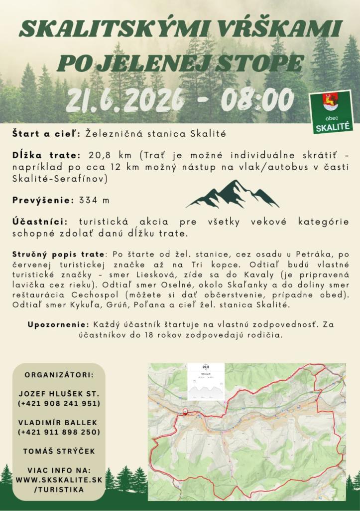 Pozývame vás na turistickú akciu „Skalitskými vrškami po Jelenej stope“, ktorá sa uskutoční 21. júna 2026 so štartom o 08:00 hod. zo železničnej stanice v Skalitom.