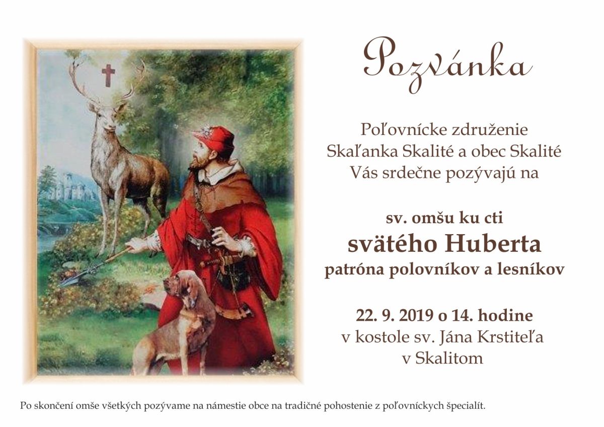 Poľovnícke združenie Skaľanka Skalité spolu s RKC Farnosťou Skalité a Obcou Skalité srdečne pozýva na slávenie svätej omše ku cti svätého H u b e r t a patróna poľovníkov a lesníkov, ktorou chcú skalitskí poľovníci a priatelia prírody už po deviatykrát poďakovať za všetky dobrodenia, dary prírody a priazeň ľudí dobrej vôle.
